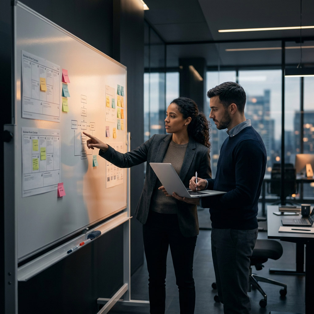 Diagnóstico de performance, roadmap de canais, planejamento de budget e alinhamento entre marketing e negócio. Estratégia antes de execução — sempre.